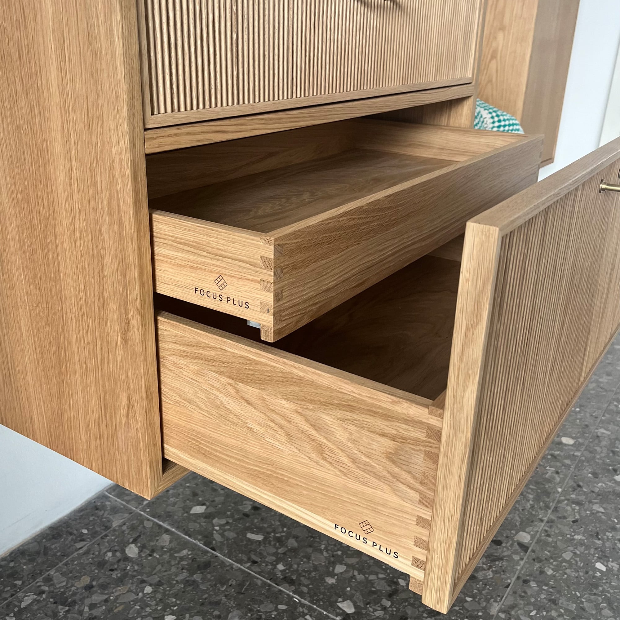 I sjældne tilfælde vil det være nødvendigt at tilpasse skufferne ud fra hvordan VVS arbejdet er udført og hvordan afløbet er placeret. Da det er en massiv skuffe vil du kunne skære bagsiden ned ud fra hvordan det passer til dit afløb.