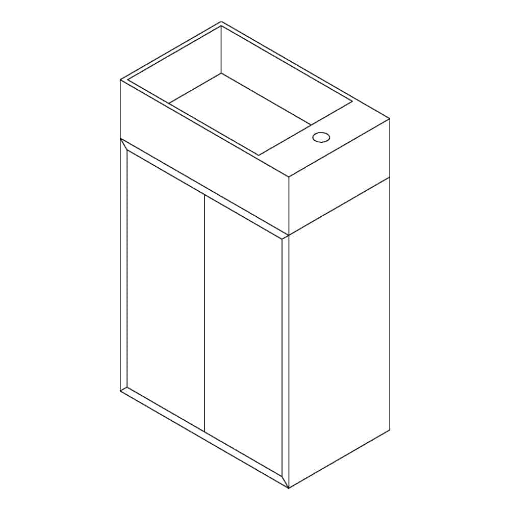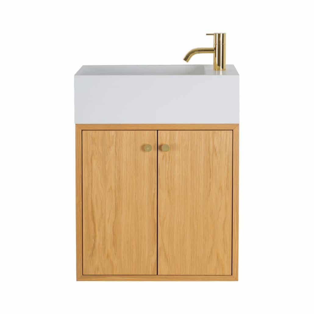 Møblet er bygget i eg, med to låger og en indvendig hylde. Det sælges inkl. greb og den originale Kubo vask, med skjult afløb. Vasken er udført i det solide Solid-Surface i mat hvid og tåler alle rengøringsmidler. Vær venligst opmærksom på, at møbel og vask kommer i 2 dele og at køber selv skal montere vasken.