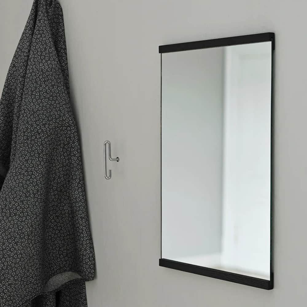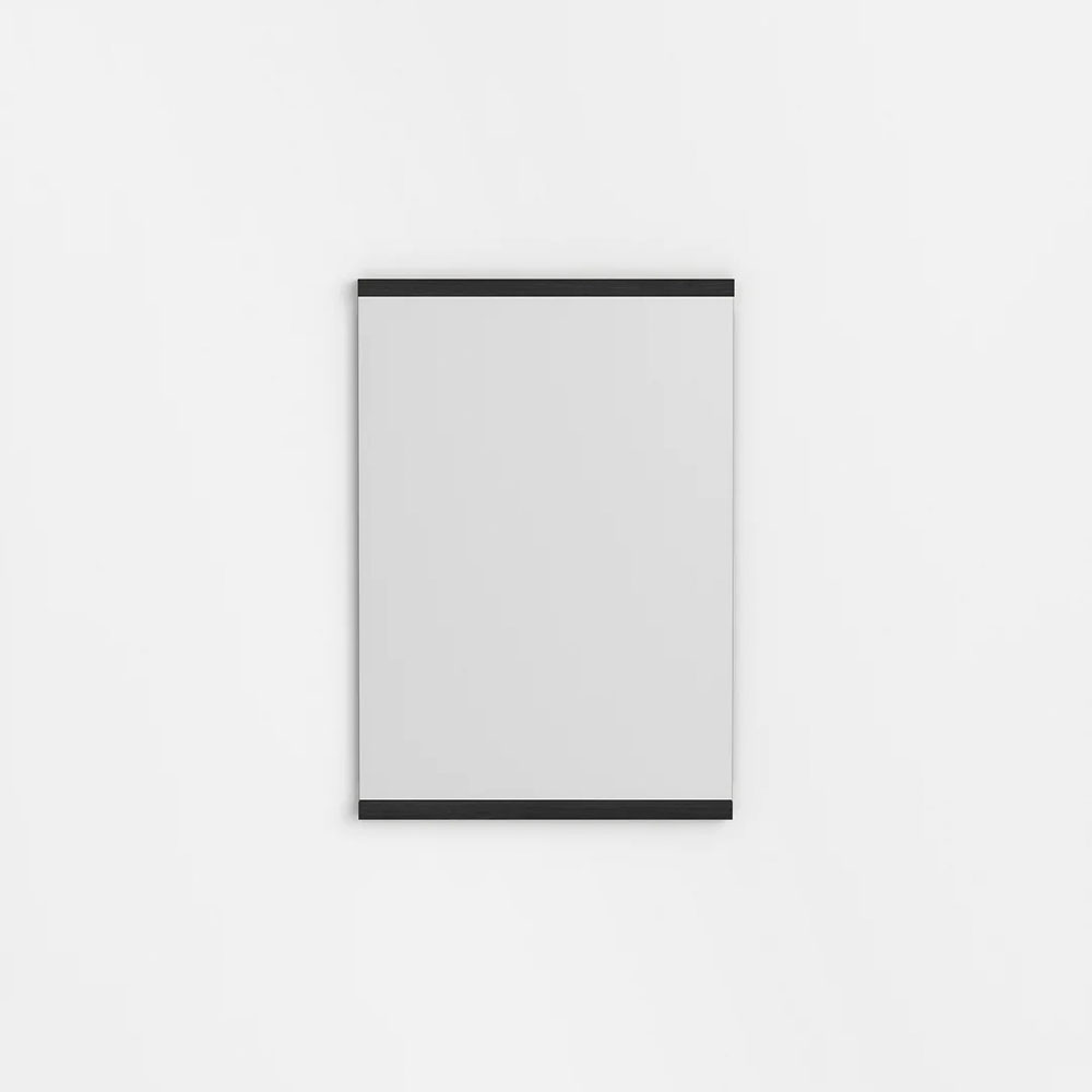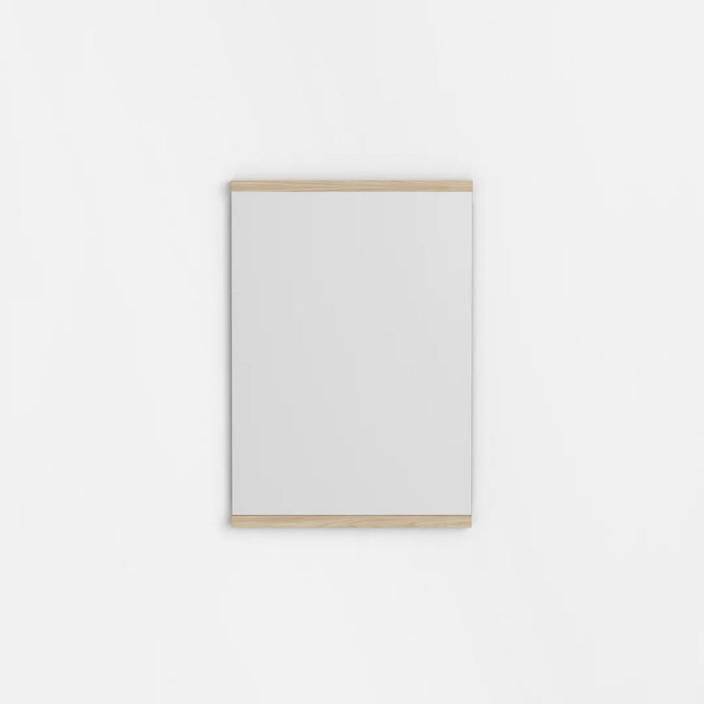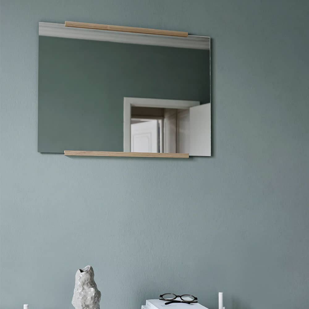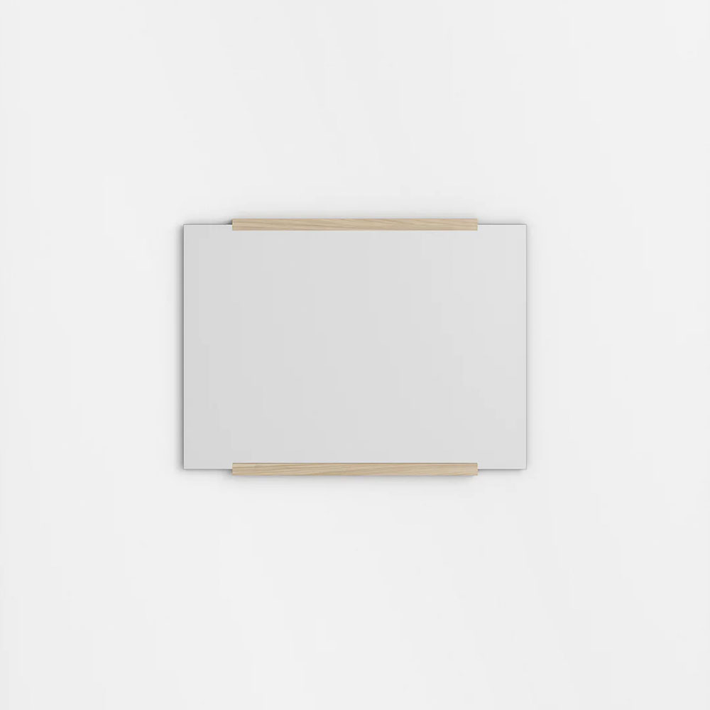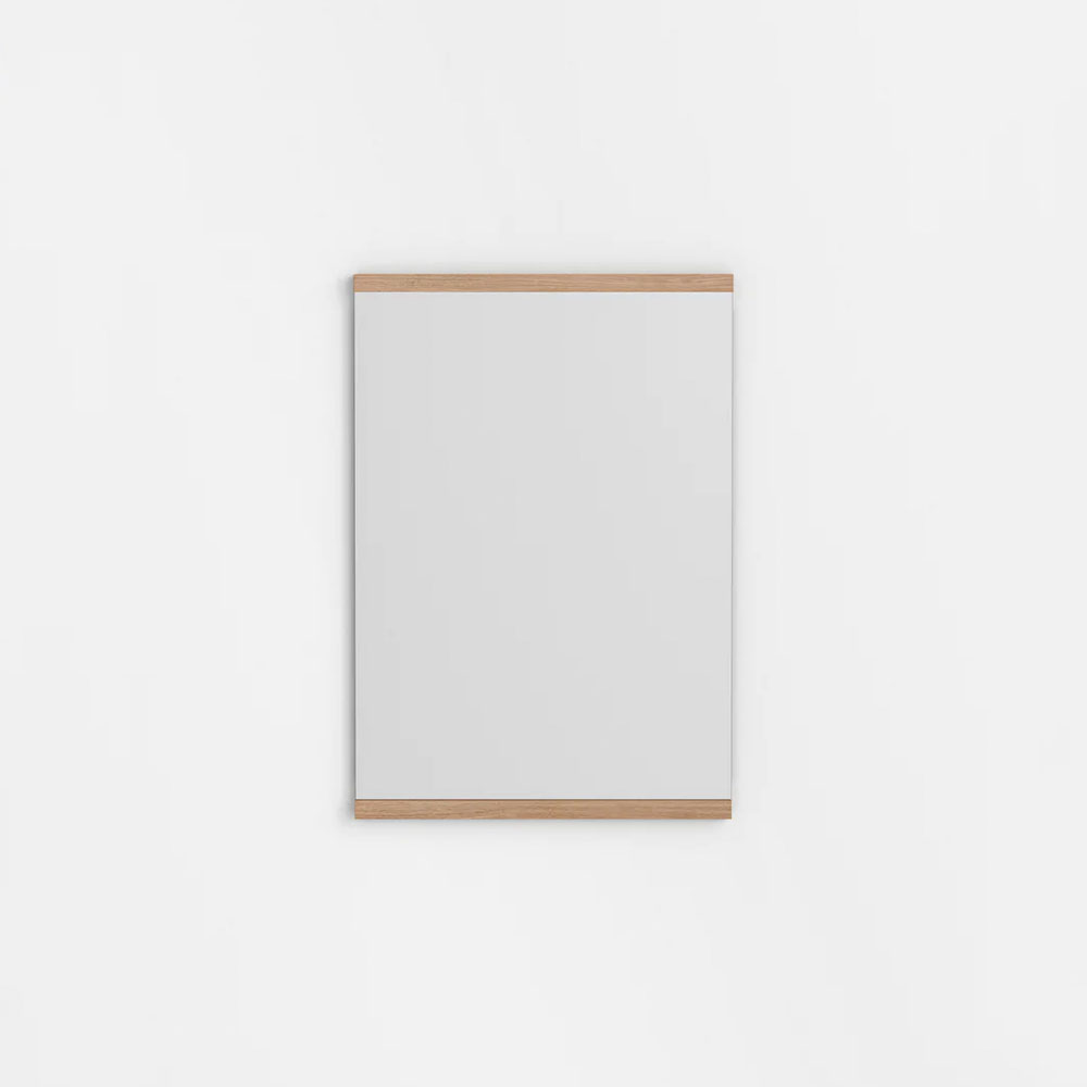 Rektangulært spejl i tre størrelser. Det består kun af et spejl og to trælister som holder spejlet, hvilket giver det et meget simpelt udtryk.