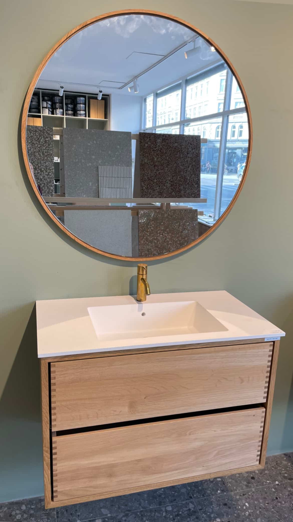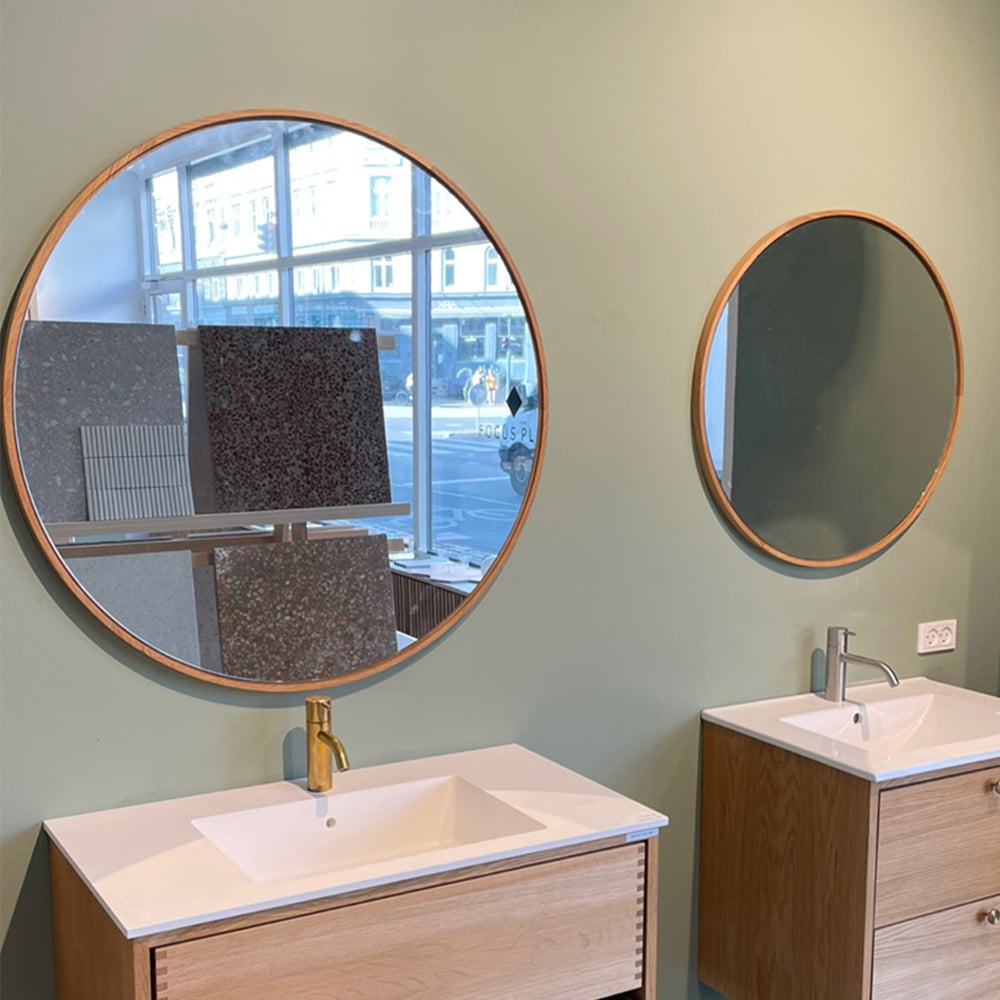 Vores runde egetræsspejle er et flot match til vores badeværelsesmøbler – eller i entreen. Fås i Ø70 og Ø90.