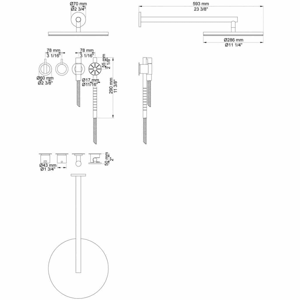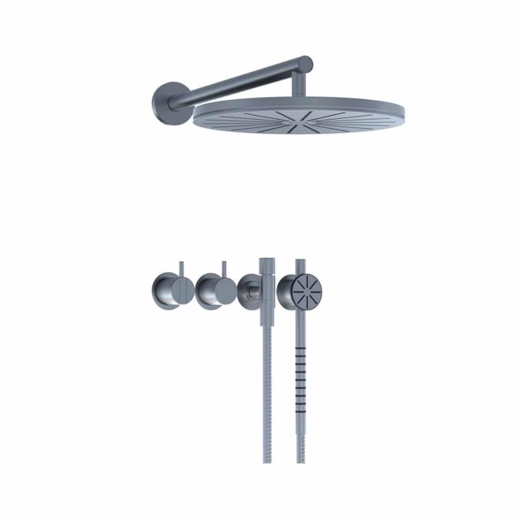 2471S-061AP = Greb NR21, omskiftergreb NR24G, håndbruser og holder til håndbruser med kontraventil 070S, vægmonteret hovedbruser 060, 4 stk. 60 mm dækrosetter 001, 60 mm dækroset 2001.