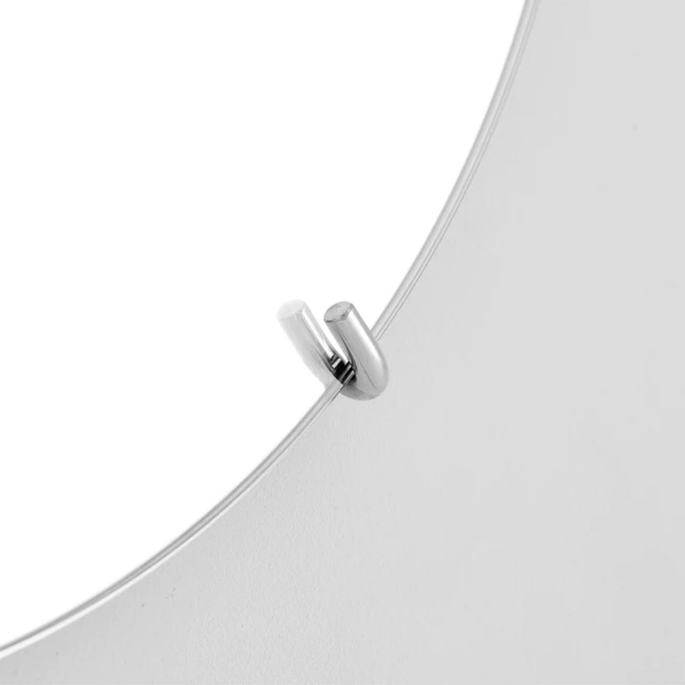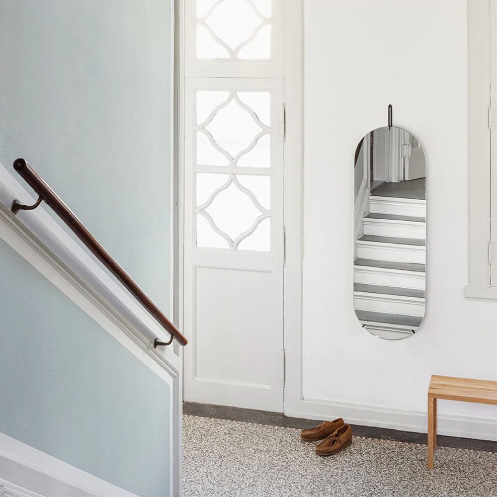 A tall oval mirror without a frame, which hangs on a thin metal holder.
