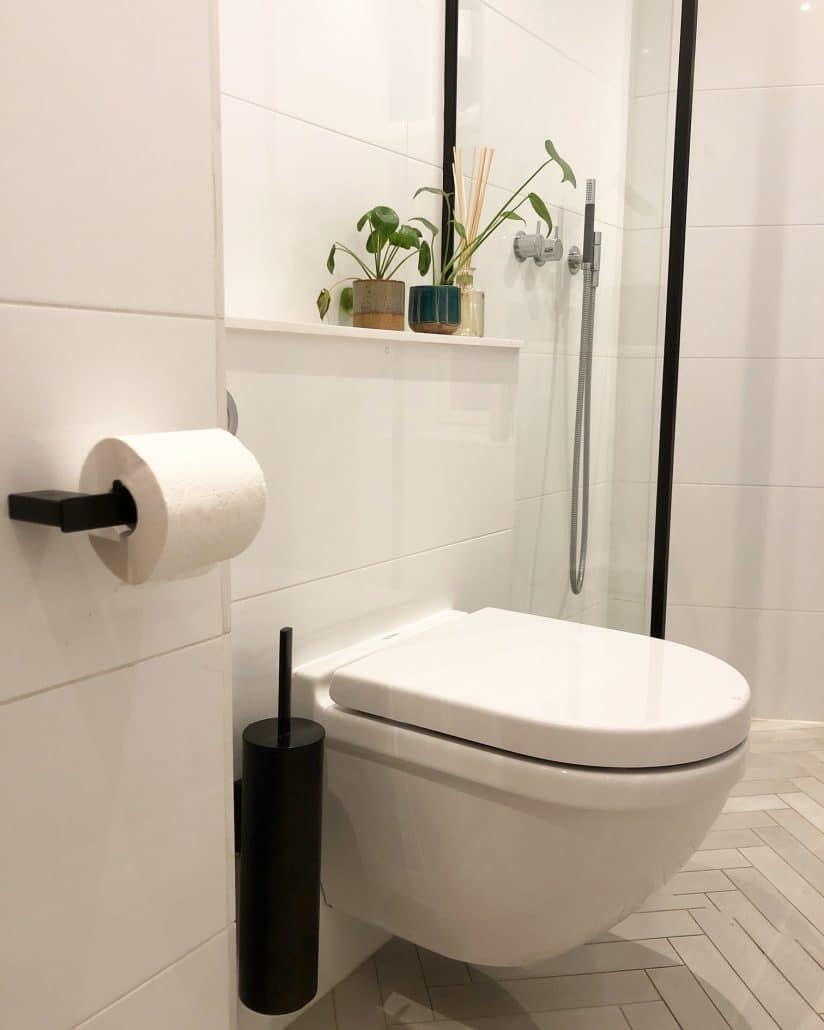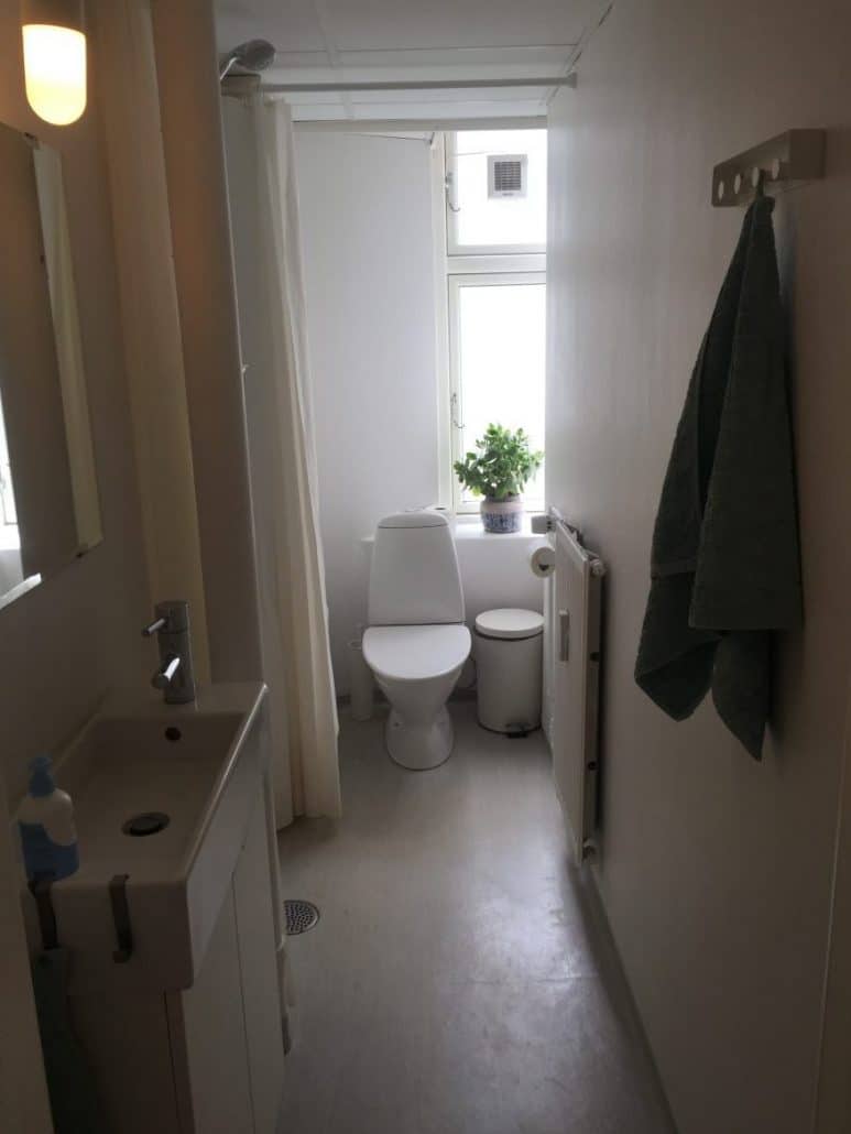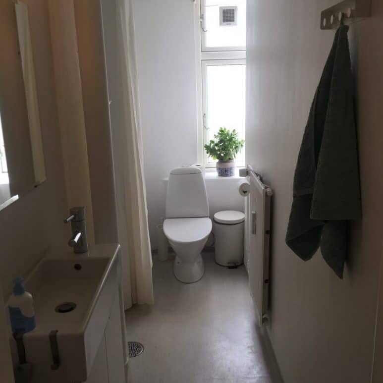 Vi tog dog udfordringen op og i samarbejde med vores VVS’er fandt vi frem til et hængetoilet med en lille kumme. Vi fjernede en radiator, og derudover bankede vi en fordybning i væggen, så Geberitophænget kunne komme længere ind i væggen. Der er stadig ikke meget plads i det lille badeværelse, men man kan sagtens komme forbi, og der er benplads nok foran toilettet. Som låg på Geberitkassen lagde vi hvid Corion, der egner sig godt til vådrum.
