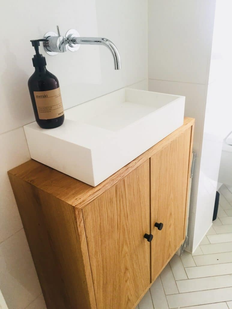 Grundet det meget smalle rum var der ikke så mange vaske eller badeværelsesmøbler at vælge imellem. Derfor valgte vi at få lavet vaskeskab i egetræ på specialmål hos en snedker. Det gav os mulighed for at udnytte pladsen bedst muligt og få et møbel, der flugter perfekt med rørkassen.