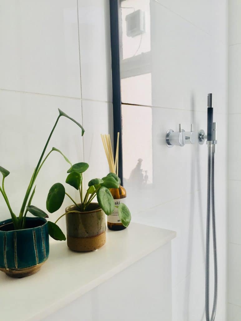 Vi ønskede så få fuger som muligt på grund af det lille rum og de mange skæve vinkler, rørkasser osv, der kræver mange skæringer i fliserne. Desuden har vi valgt en hvid epoxyfuge for at skjule fuger og skabe visuel ro. (Psst epoxyfuger bliver i øvrigt ikke gule og grimme af kalk). Den blanke flise er en fin kontrast til det matte gulv og bringer desuden mere lys ind i det lille badeværelse.