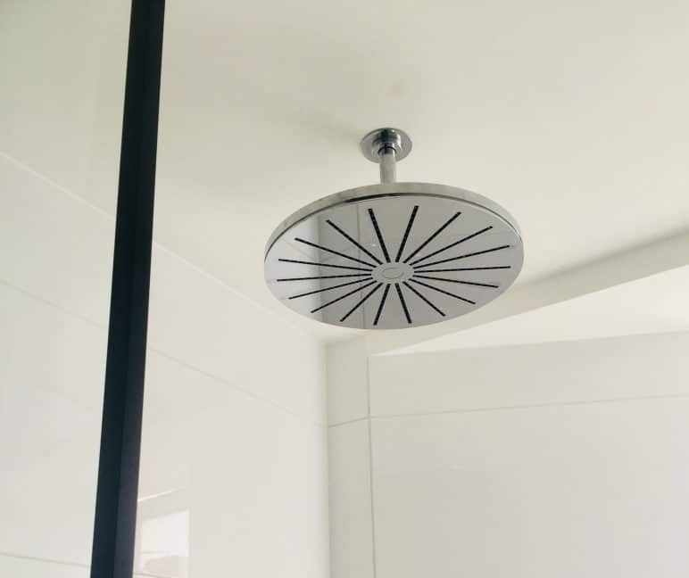 Heldigvis var overboen samarbejdsvillig, og vi fik skiftet afløb og rør hos overboen, hvilket gav os ca. 20 cm. ekstra loftshøjde. Nu kunne vi få plads til både spots og rørføring til lofthængt brusehovede i det lille badeværelse.