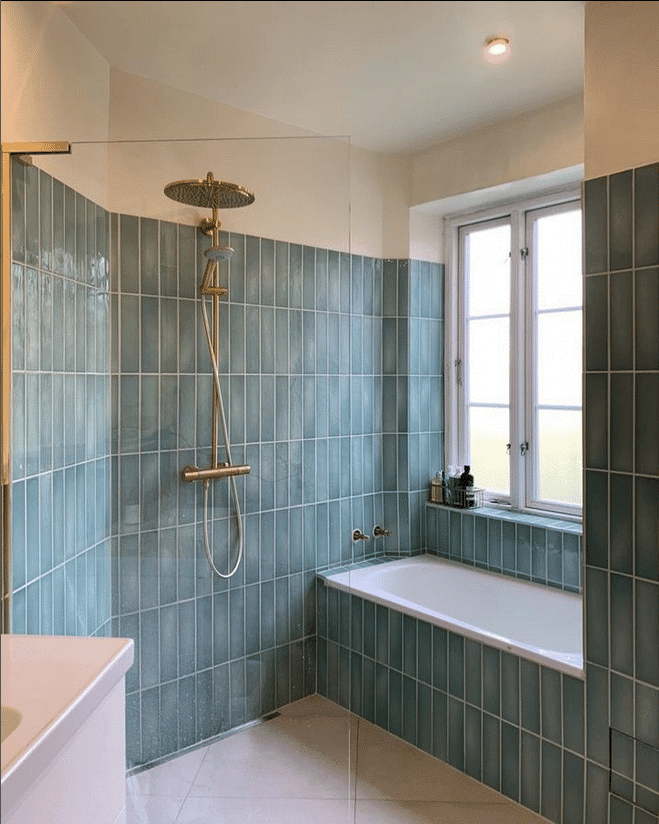 Her ser du et projekt, hvor vi hjalp kunden med at opsætte mintgrønne vægfliser på deres badeværelse. Vægflisen er Viggo af keramisk materiale, der også kan fås i et væld af andre farver.