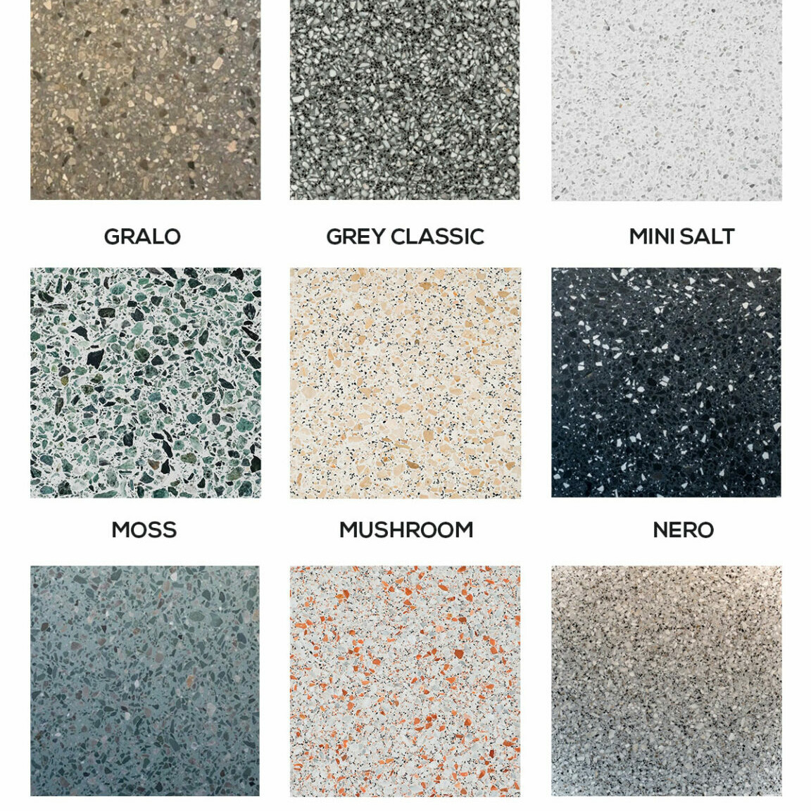 Terrazzo fliser fås i flere forskellige farver og udtryk, som passer ind i de fleste hjem. Det er en alsidig flise som oftest består af marmorstykker, glas eller andre småsten, som alle er støbt i indfarvet cement. Hver flise er unik og ved at vælge en terrazzo flise på 60×60 cm fremfor en mindre flise, minimere du antallet af fuger og får derved et mere ensartet udtryk på dit gulv eller væg.