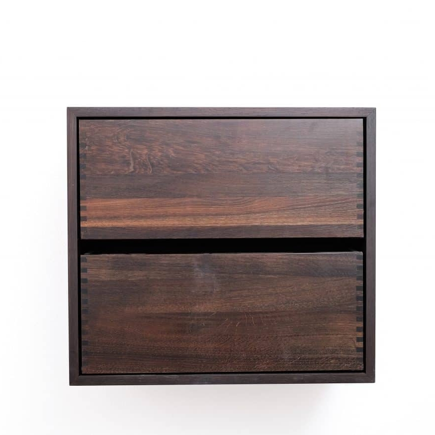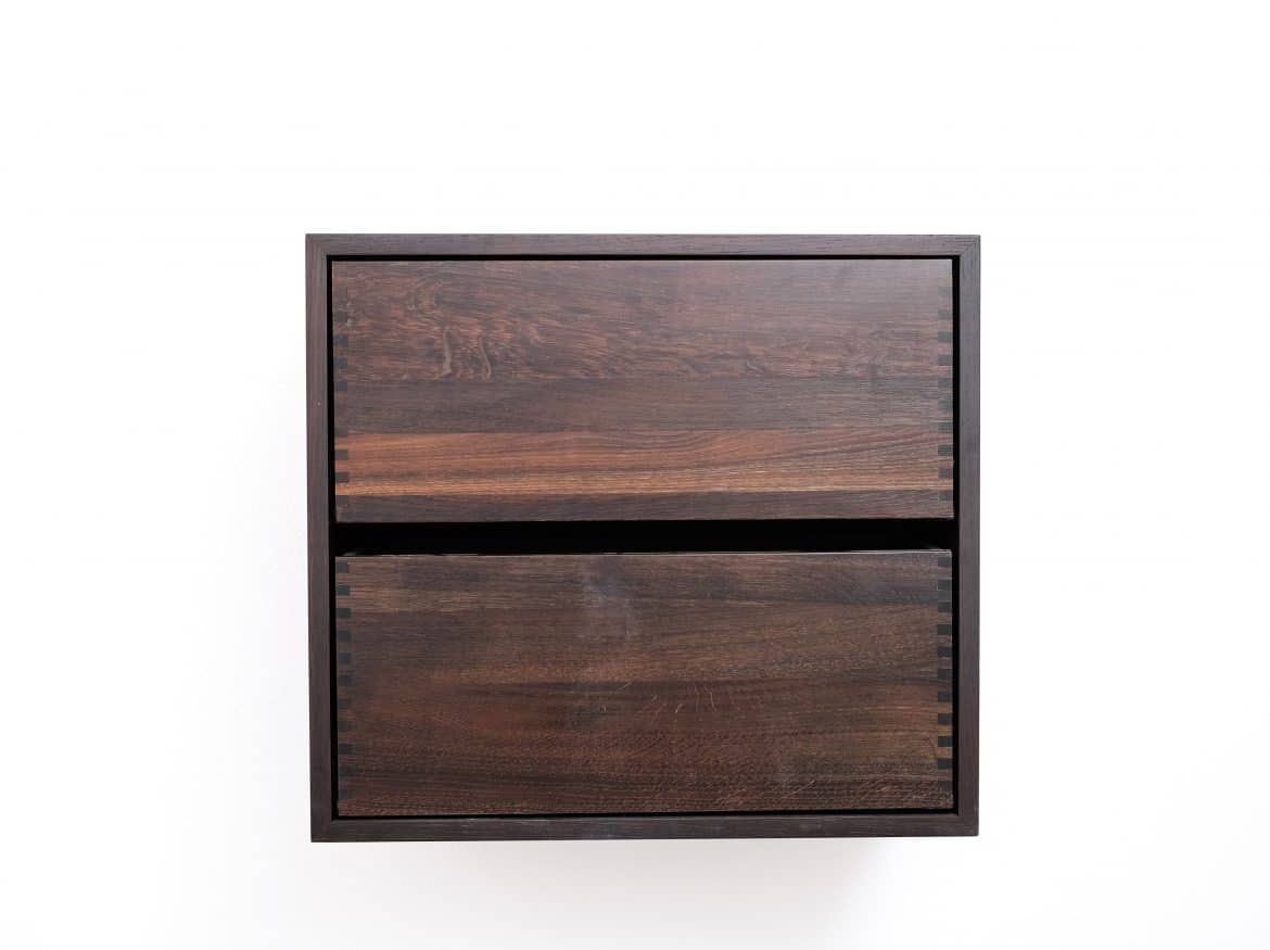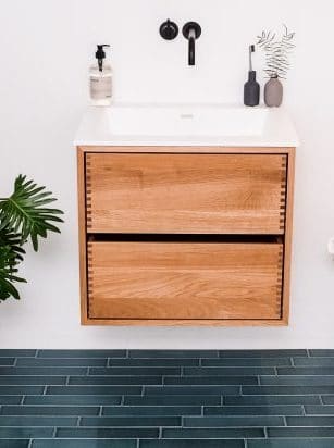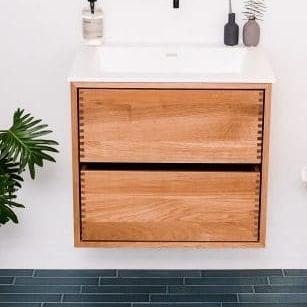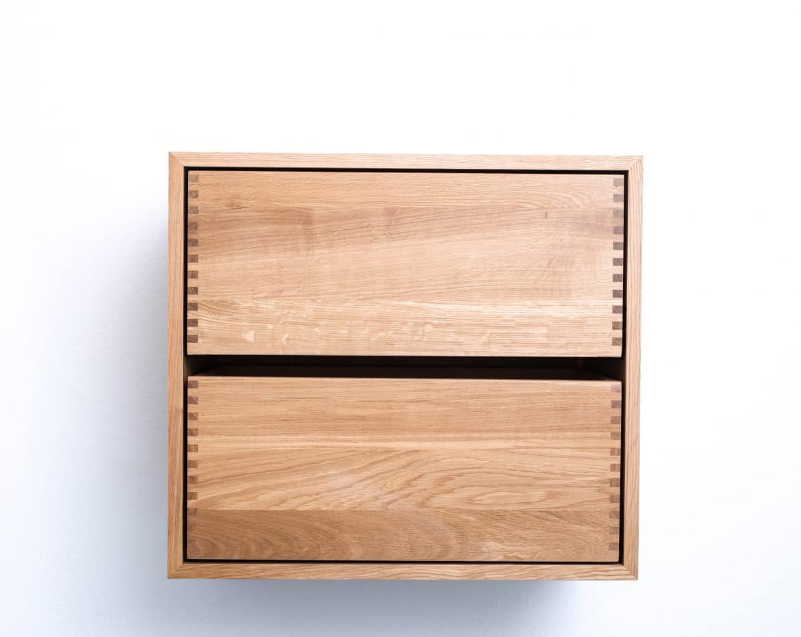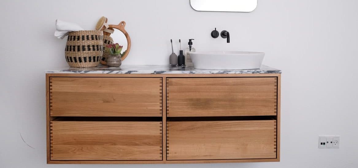 Vores overbevisning var, at det måtte være muligt at designe og producere et snedkereret møbel i en billigere prisklasse. Så der blev skriblet, tegnet, snakket med snedkerier og sat gang i prototyper. Tegnet om igen, tilpasset, finjusteret og endelig kom vi i mål med vores første serie af snedkerlavede badeværelsesmøbler.